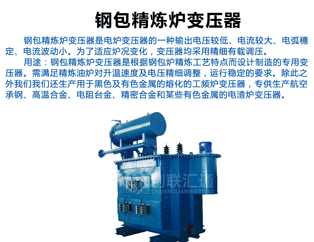 鋼包精煉爐變壓器是根據(jù)鋼包爐精煉工藝特點(diǎn)而設(shè)計(jì)制造的專用變壓器。需滿足精煉油爐對升溫速度及電壓精細(xì)調(diào)整,運(yùn)行穩(wěn)定的要求。除此之外創(chuàng)聯(lián)匯通電氣還生產(chǎn)用于黑色及有色金屬的熔化的工頻爐變壓器,專供生產(chǎn)航空承鋼、高溫合金、電阻臺金、精密合金和某些有色金屬的電渣爐變壓器。